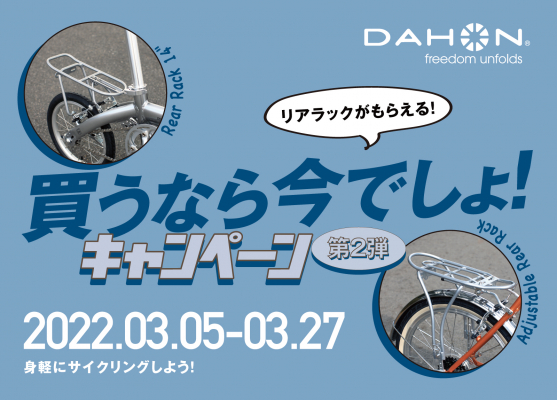 DAHON日本代理店の株式会社アキボウ(本社:大阪府堺市 代表取締役社長:西木 一彦)は、期間中にCalm、D-Zero、Dove Plusをご購入された方を対象に、リアラックを無料でプレゼントするキャンペーン「身軽にサイクリングしよう!買うなら今でしょ!キャンペーン第2弾」の実施を開始いたしました。