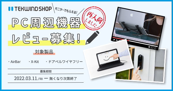 テックウインド株式会社(代表取締役社長:王夢周、本社:東京都文京区)が運営しているTEKWINDショップでは、対象の製品をご使用された感想や評価レビューをご自身のブログやYouTube等に掲載いただく、レビュアー募集を開始しております。この度は、主なレビュー対象製品である、AirBar、X-Kit、ドアベルの3製品に関して、ご好評につき、数量+5ずつ再入荷することが決定いたしました。製品が無くなり次第、終了とさせていただきますので、お早めにご確認ください。