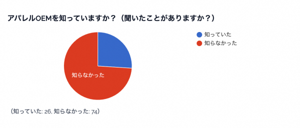 「アパレルOEMを知っていますか?(聞いたことがありますか?)」について、「知っていた」が26%、「知らなかった」が74%という結果でした。