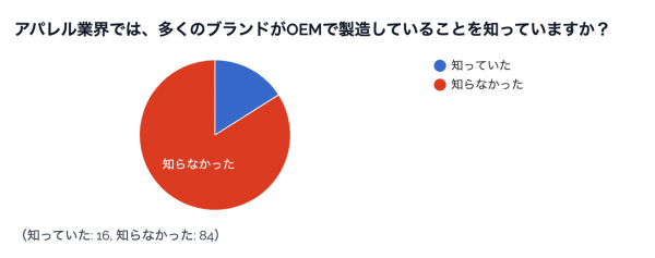「アパレル業界では、多くのブランドがOEMで製造していることを知っていますか?」について、「知っていた」が16%、「知らなかった」が84%という結果でした。
