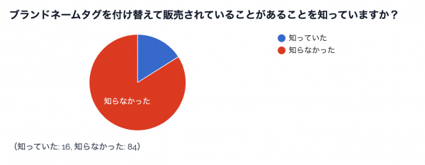 「ブランドネームタグを付け替え」については、「知っていた」が16%、「知らなかった」が84%という結果でした。 また、ブランドネームタグを付け替えの印象は、「あまり良いと思わない」が52%と、印象が良くないことが分かりました。