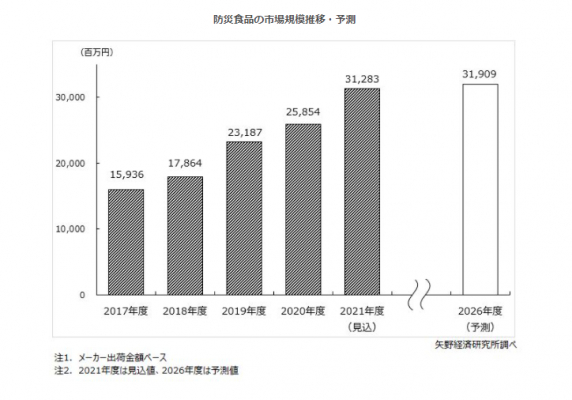 防災食品市場では、5年を賞味期限とする商品が震災発生から2回目の入替え時期を迎えたことで、2021年度は通常よりも纏まった需要が見込まれることから、2021年度の同市場は同121.0%の312億8,300万円の見込みである。
