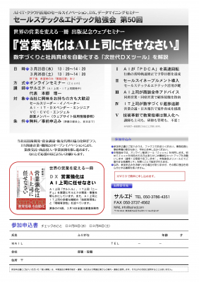 3月23日・26日開催の「第50回」は節目であり、主宰・本郷理一が3月8日に刊行した初著作『営業強化はAI上司に任せなさい』(トラスト出版)の出版記念ウェブセミナーとします。