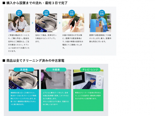 新生活を始める方の中には、大学4年間や単身赴任期間のみなど、期間限定の利用で家電を買い揃える方も多いため、メーカーや年式にこだわらず、安く、一気に買い揃えたいというニーズに応える新サービスです。近年の消費動向では、中古品を選ぶことで家電の購入費用を抑え、趣味やインテリアなど、よりこだわりたいアイテムに資金をまわす等、賢くリユースを活用される方も増えています。