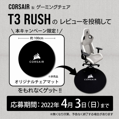 株式会社リンクスインターナショナル(本社:東京都千代田区、代表取締役:川島義之)は、CORSAIR製ゲーミングチェア「T3 RUSH」をレビューするとCORSAIRオリジナルチェアマットがもらえる、「CORSAIR T3 RUSH レビューキャンペーン第2弾」を2022年3月11日から2022年4月3日まで開催いたします。