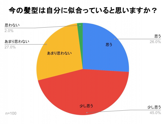 先ほどのアンケートでは31%の人が今の髪型を気に入っているという結果となりましたが、似合っていると回答した人は26%と-5%の差がみられました。