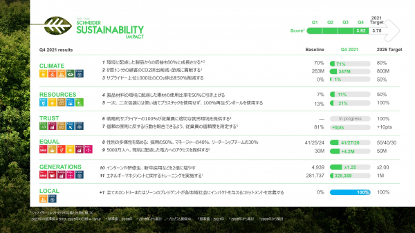 シュナイダーエレクトリックは、2021年のSSI スコアを 10点満点中 3.92 点とし、5カ年プログラムの初年度として目指していた3.75 点を超える結果となりました。