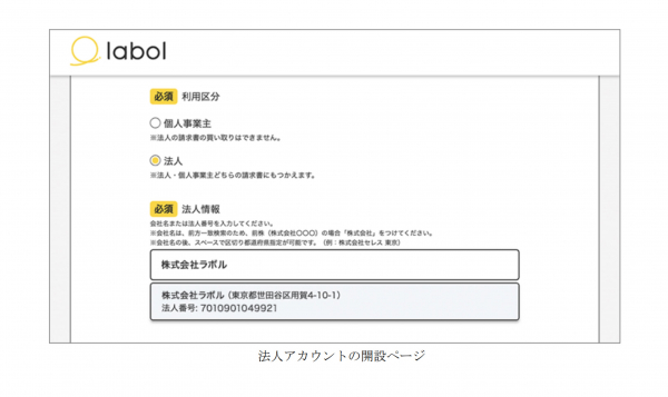 2020年7月のサービス開始から「labol(ラボル)」の利用者はフリーランス・個人事業主に限定していましたが、今回より法人アカウントの受付を開始したことで、法人として発行した請求書の買取申請が可能となります。なお、法人アカウントの開設にあたっては登記簿などの書類提出は不要です。また、これまでフリーランス・個人事業主としてご利用いただいていた「labol(ラボル)」のアカウントを法人アカウントに切り替えることもできるため、利用者の業態変化に柔軟に対応できるようになります。
