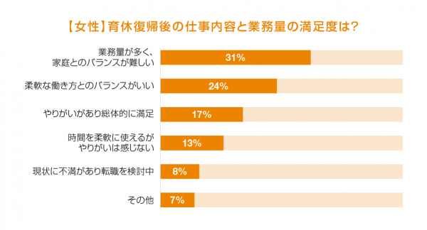 育休取得者の職場復帰後の仕事内容の変化については、「変化なし」は6割、「転職をした」は21%、「意図せずに違う職務についた」が15%でした。一方、育休復帰後の仕事内容と業務量の満足度に対しては、あわせて41%が「柔軟な働き方ができておりバランスがいい」、または「やりがいに満足している」と回答。「やりがいはあるが業務量が多く、家庭とのバランスが難しい」と答えたのは31%、「時間は柔軟に使えているが、やりがいはあまりない」は13%でした。
