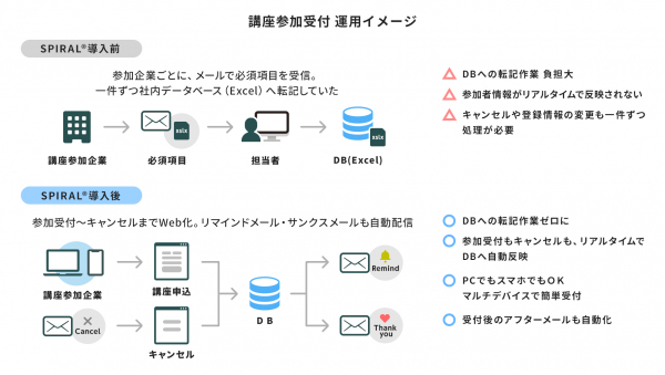 講座の参加受付時に、企業ごとに業種コードを振り分ける設定にしたことで、どの業界の企業がどのくらい参加していたかなど、より精度の高い分析結果を地方自治体に報告することが可能となりました。また、参加者リストは「スパイラル(R)」からダウンロードするだけで作成できるため、地方自治体への報告業務がスムーズになりました。