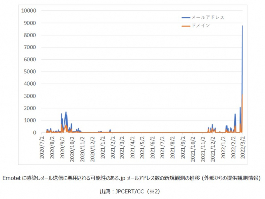 2021年1月に一度制圧された「Emotet」ですが、2021年11月頃から再び観測され始めたことをきっかけに全世界で被害が拡大傾向にあり、その数は2022年3月の時点で2020年の感染ピーク時に比べて5倍以上に急増していることから、IPA(独立行政法人情報処理推進機構※1)やJPCERT/CC(一般社団法人JPCERTコーディネーションセンター※2)等の、国内の関連機関から強く警戒を呼び掛ける案内が発表されています。