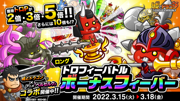 株式会社アソビズム(本社:東京都千代田区、代表取締役:大手智之)は、App Store・Google Playにて好評配信中の『城とドラゴン』で、「トロフィーバトル ボーナスフィーバー」を2022年3月15日(火)より開催いたします。