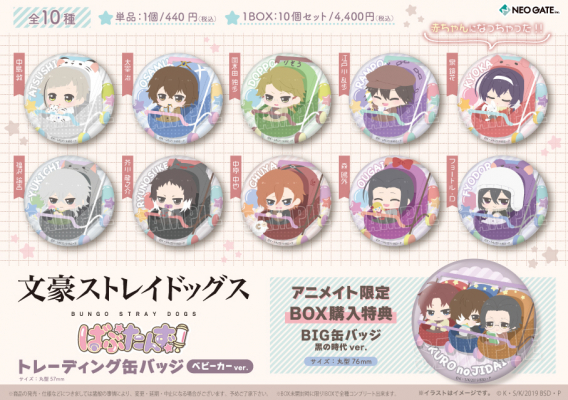 また、アニメイトでコンプリートボックスをご予約いただくと、特典として、太宰 治(黒の時代)、織田 作之助、坂口 安吾の 3 名が仲良く並んでいる【黒の時代 ver.】の BIG 缶バッジ(76mm サイズ)がもらえます。