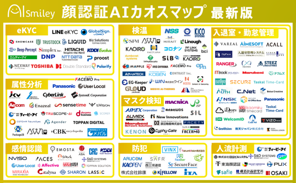 ※このカオスマップは顔認証サービスを提供している企業のプレスリリースや製品サイト、導入実績などの公開情報を基にAIsmiley編集部が独自の視点で取りまとめたもので、網羅性や正確性を完全に担保するものではありません。