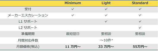 本サービスは、アウトソースする対応レベルに応じて、3段階の料金プランから選択できます。月間のお問い合わせ数が10件以下のスモールスタートが可能なため、小規模展開やスタートアップの事業に最適です。10件を超過した分は従量課金制になっており、費用面のリスクを削減します。