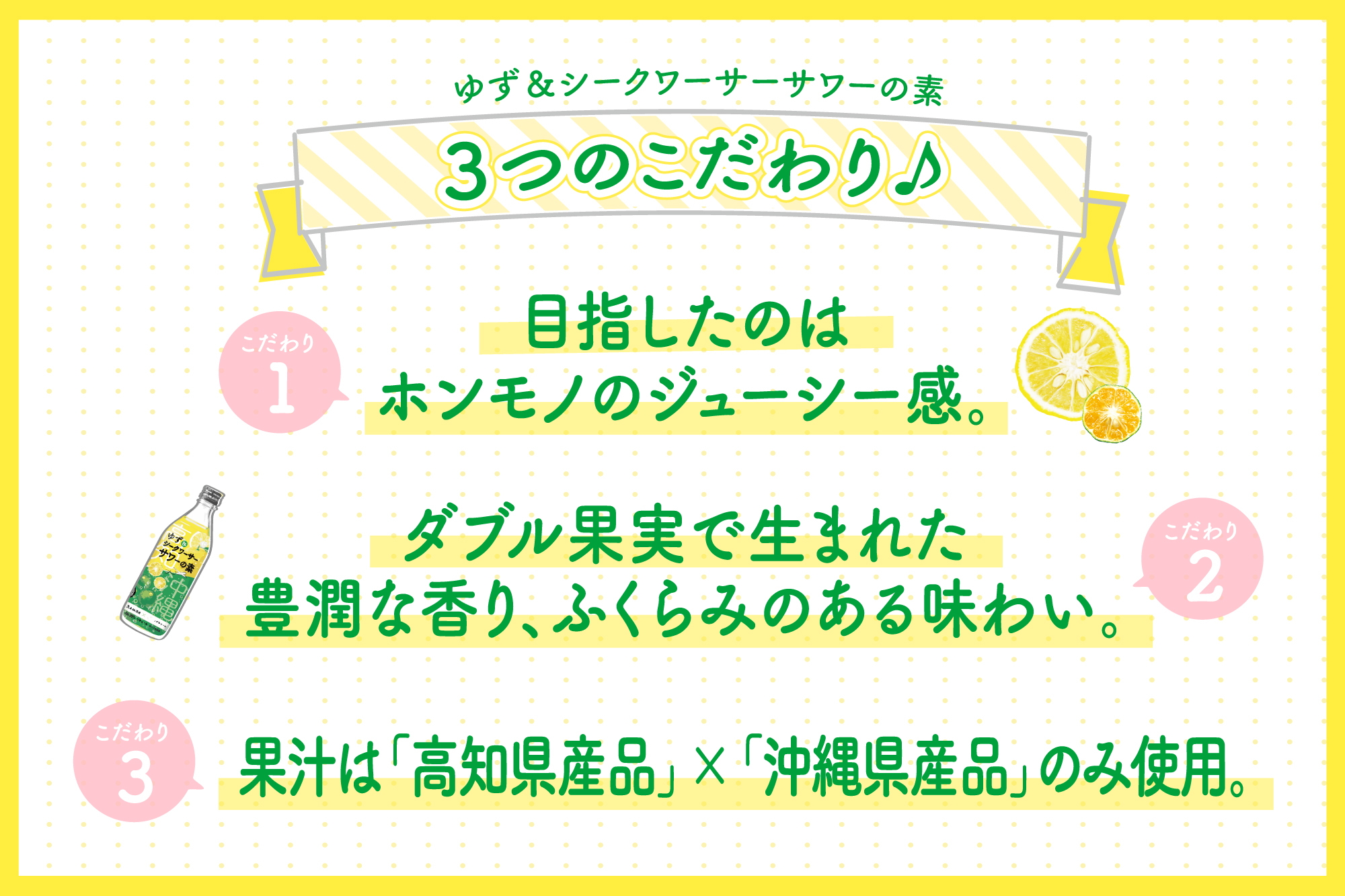 『ゆず&シークワーサーサワーの素』では、2つの果実を合わせたホンモノの果実感・ジューシー感を追求し、ダブル果汁ならではのジューシーな味わいの開発に成功しました。