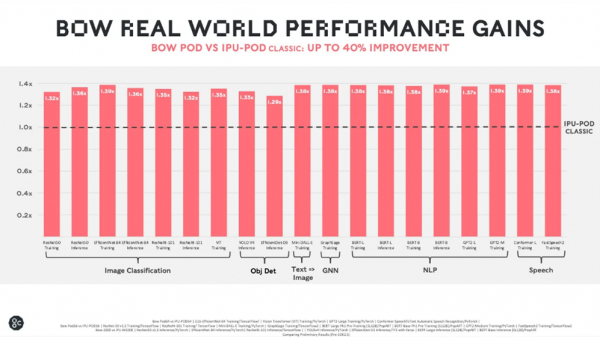 Bow Podは、自然言語処理用のGPTやBERT、コンピュータビジョン用のEfficientNetやResNet、グラフニューラルネットワークなど、幅広いAI用途に向けて実世界の性能を大規模に提供するためのものです。Bow Podシステムを導入したことで、当社のMk2 IPU-Podシステムと同じピークパワーエンベロープにおいて、幅広いAI用途で性能が最大40%向上した事例も報告されています。