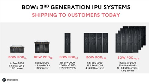 Bow-2000は既存のIPU-PODシステムと完全な下位互換性があり、高速で低遅延のIPUファブリックや柔軟な1Uフォームファクタはすべてそのままです。Bow-2000は、DellやAtos、Supermicro、Inspur、Lenovoなどの主要ブランドのホストサーバと組み合わせてBow Podシステムを構成しており、4台のBow-2000と1台のホストサーバで構成されるBow Pod16から、8台のBow-2000と1台のホストサーバで構成されるBow Pod32、Bow Pod64、より大型の当社主力システムであるBow Pod256やBow