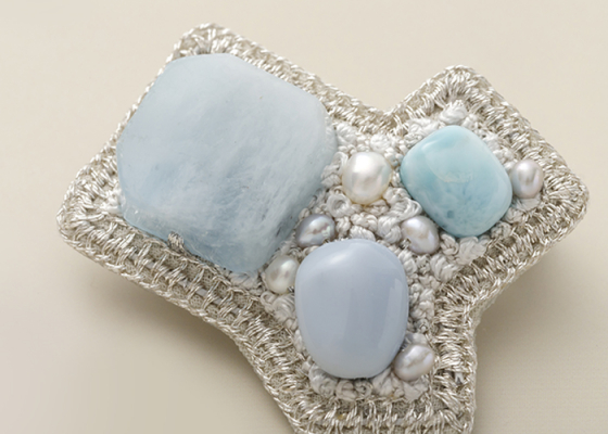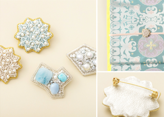 刺繍ジュエリー作家の石渡明子さんが手がけるのは、日本刺繍に使われるmade in 京都の絹糸や、金銀糸を用いて真珠や天然石を縫い込んだ、全てが1点ものとなるブローチ。