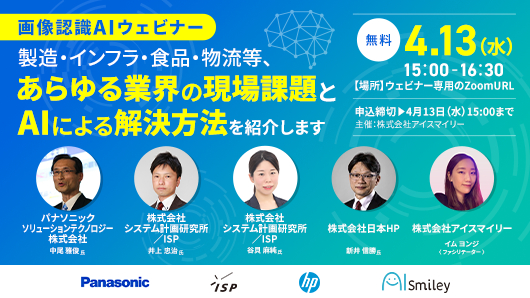 人工知能を搭載したサービスの資料請求ができるAIポータルメディア「AIsmiley」を運営するアイスマイリー(東京都渋谷区、代表取締役:板羽晃司)は、2022年4月13日(水)15時から「現場の課題解決に特化した画像認識AI」をテーマにウェビナーを開催します。