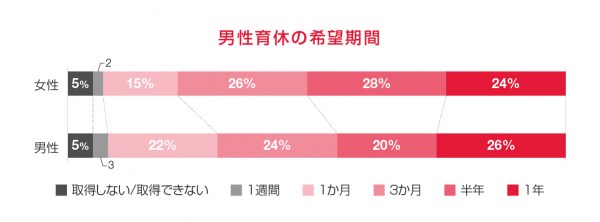 「育休取得の希望期間」において、女性が男性パートナーに取得してほしい期間は、1位「半年」(28%)、2位「3カ月」(26%)、3位「1年」(24%)という結果でした。反対に男性自身が育休を取得したい期間の1位は「1年」(26%)、2位「3カ月」(24%)、3位「1カ月」(22%)でした。男性自身の育休希望期間は、長期間から短期間まで、人によって、かなりばらつきがあります。