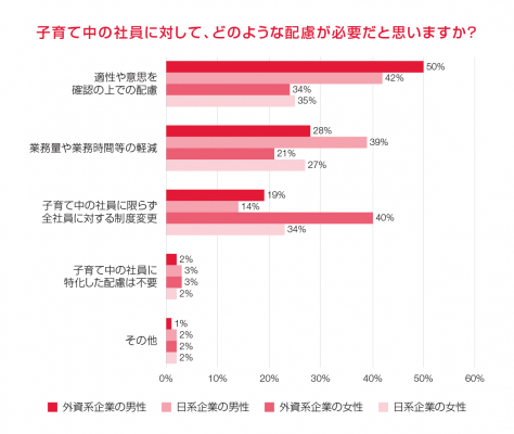 子育て中の社員に対してどのような配慮が必要だと思うかを尋ねた質問では、「子どもがいる、いない」にかかわらず、外資系企業に勤務している男性の半数が「子育て中の社員の適性や意思の確認」(50%)と回答、日系企業の男性は「適性や意思の確認」(42%)に加え、「業務量や業務時間等の軽減」(39%)を上位に挙げました。一方で外資系企業の女性の回答は「子どもがいる人への一律の配慮ではなく、社員全体への制度変更」(40%)が最も多い結果でした。日系企業の女性も34%が「一律の配慮は不要」と回答。子育て中だからという理由で業務量を軽減するような一方的な配慮は、一概に必要とは言えないということがわかりました。