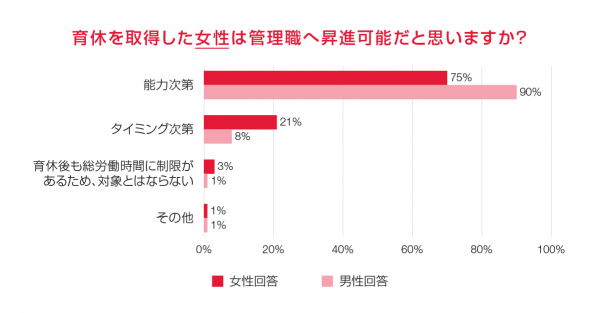 「育休を取得した人が、管理職への昇進対象者となり得るのか」について、男女ともに「能力次第」との声が最も多かったものの、「女性が育休を取得した場合」において、女性回答者の約5人に1人が「タイミング次第」(21%)と感じています。一方、男性の「タイミング次第」との回答はわずか8%にとどまりました。