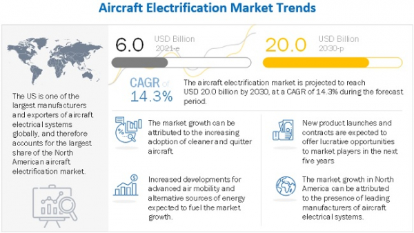 MarketsandMarketsはレポートの公開資料において、航空機の電動化市場は2021年に60億ドル、2030年までには200億ドル規模へ達し、予測期間のCAGRは14.3%になるとの予測結果を発表しました。航空機の電動化市場の成長は環境に配慮した航空機の採用の増加、高度エアモビリティの発展、代替エネルギーが主な促進要因となっています。