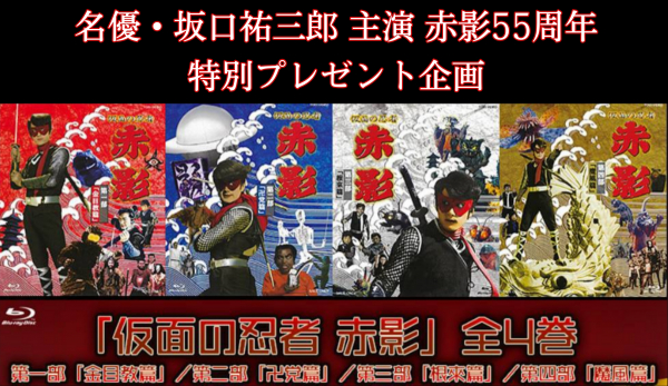 赤影役で一世風靡した坂口祐三郎の、その後の苦悩をまとめた小説『仮面と生きた男』と『坂口祐三郎/赤影参上』の著者である瀬崎智文が代表取締役社長を務める株式会社AMIプロジェクト(所在地:北九州市小倉北区)は、特別コラボ企画として、赤影Blu-rayを抽選で各シリーズ合計4名様にプレゼントします。