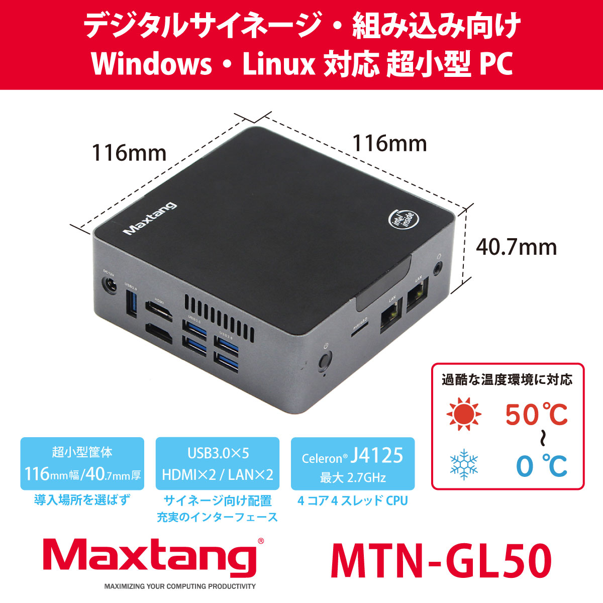デジタルサイネージ・組み込み向け 超小型デスクトップパソコンMaxtang MTN-GL50は、4コア/4スレッドの高性能なIntel(R) Celeron(R) Processor J4125を搭載した超小型デスクトップパソコンです。わずか116mm四方の超小型筐体で、デジタルサイネージや組み込みなど設置場所に制約のある用途に最適です。HDMIを2ポート搭載し、4K@60Hz表示とデュアルディスプレイに対応します。0℃から50℃までの過酷な温度環境にも対応し、Windows 10 Pro初期搭載する一方、Ubuntu等Linux環境向けにOSレスのモデルもラインアップ。デジタルサイネージや組み込みなど法人用途に最適です。
