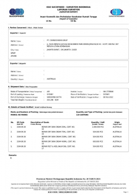この新しい規則により、化粧品の輸入許可要件に重要な変更が加えられました。以前は、化粧品の輸入にはSKI(Surat Keterangan Impor :輸入通知書)のみが必要でしたが、通関手続きに必要な要件の1つとしてSurveyor Report(Laporan Surveyor)が追加されました。 (2022年1月1日から施行)