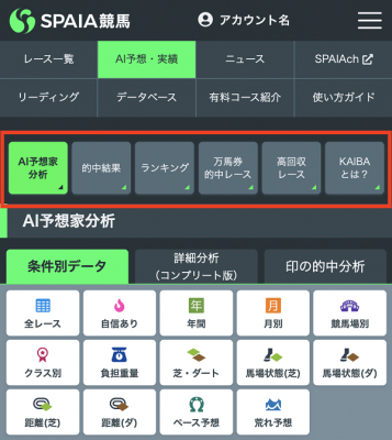 これまでの AI 予想・実績ページのローカルメニューは1行横スクロールする形式でしたが、SPAIA 競馬をより快適に利用していただくためアイコンボタン化しました。今回の変更により、見た目の分かりやすさに加えスクロールせず見たいページのリンクをタップすることが可能になりました。AI 予想・実績ページは AI 予想家のこれまでの的中実績やどのレース傾向で的中率を上げているのか分析可能です。今後もユーザーの皆さま、競馬ファンの皆さまに愉しんでいただけるよう、より一層使いやすい・視認しやすいリニューアルを随時予定しております。