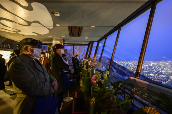 サミット第二部では「札幌夜景視察ツアー」を開催。リフトに乗車し、大倉山展望台へ上り夜景を鑑賞。サミット記念特別企画として「OKURAYAMA MR Night view」イベントも実施しました。最新スマートグラスを通して夜景を眺めると、夜景の中に丸々もとおを模したキャラクターが登場。参加者は大倉山の夜景をバーチャルとリアルの複合現実(MR)で楽しむという、驚愕の夜景演出を体験しました。第三部ではレストラン「ヌーベルプース大倉山」懇親会を実施。道産食材を用いた美味なるフレンチのコースに舌鼓を打ちながら、日本各地の観光リーダー達は有意義な交流を深めました。