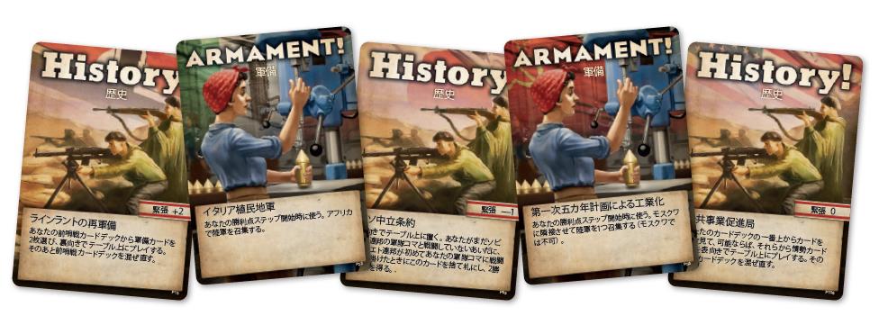 カードには《独ソ不可侵条約》、《1936年スペイン政変》、《満州事変》などの歴史カード、《戦車に注目せよ!》や《アメリカ陸軍航空隊》、《冬戦争》などの軍備カードがあり、事前に勝利点を得たり、軍隊を設立したり、他国の軍隊コマを除去するなど、第二次世界大戦勃発までに自国に有利な状況を導くことができます。