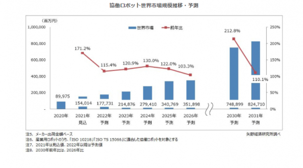 さまざまな業界で自動化のニーズが高まり、市場の拡大や参入プレーヤーの増加で本体価格も低下し、2031年の協働ロボット世界市場規模はメーカー出荷台数ベースで326,397台、同出荷金額ベースで8,247億1,000万円まで成長するものと予測する。