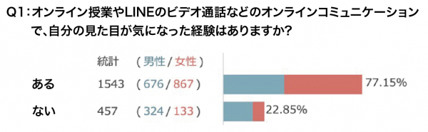「オンラインコミュニケーションで自分の見た目が気になった経験はありますか?」という質問に77.15%が『はい』と回答。女性では86.7%にも及び、PCやスマホ画面に映った自分の見た目が気になったという人が多いことがわかりました。