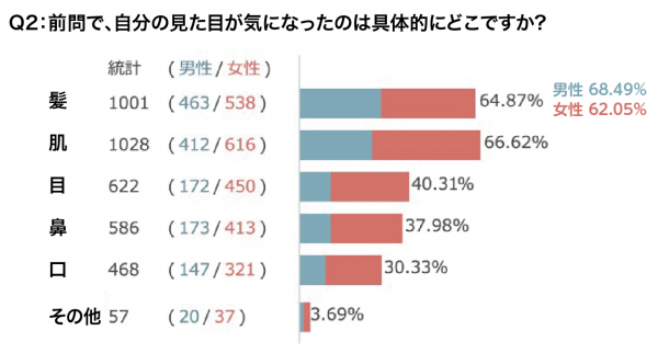 オンラインコミュニケーションで自分の見た目が気になった人に「気になったのは具体的にどこですか?」と質問したところ、男性では「髪」が68.49%でトップ。女性でも「肌」につづき「髪」が62.05%で2番目に多くなりました。