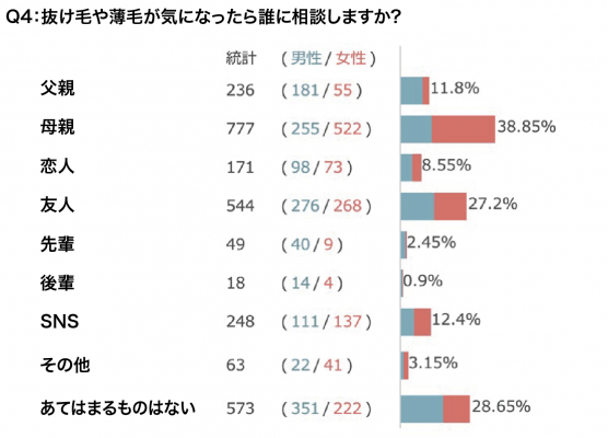 (4) 抜け毛や薄毛が気になったときに相談する相手は「母親」(38.85%)がトップ