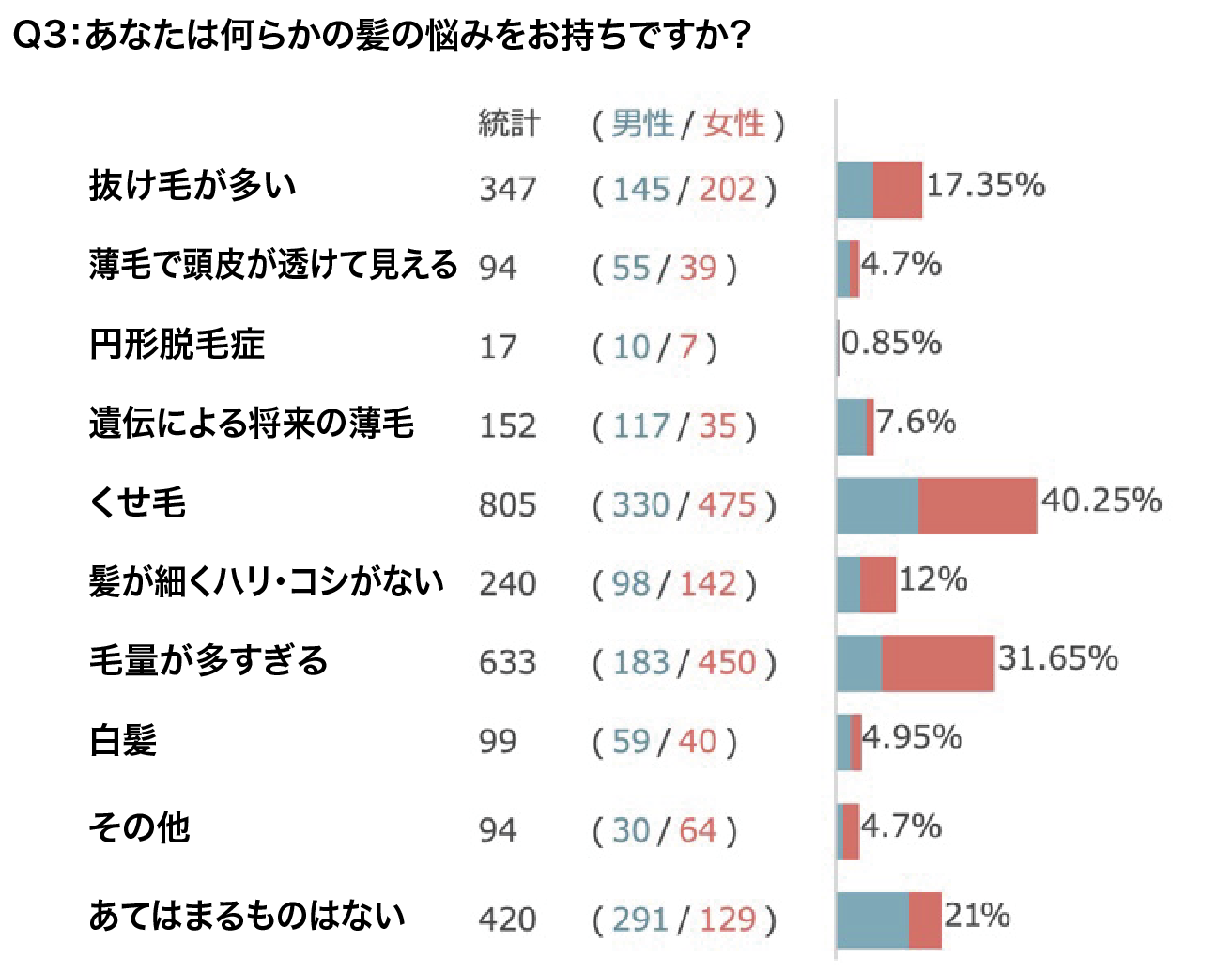 髪の悩みとは無縁というイメージの新成人ですが、「抜け毛が多い」と答えた人が17.35%、「頭皮が透けて見える」という人も4.7%ありました。およそ5人に1人は、抜け毛や薄毛の悩みを持っていると結果に。また、「白髪」を気にする人も4.95%見られました。