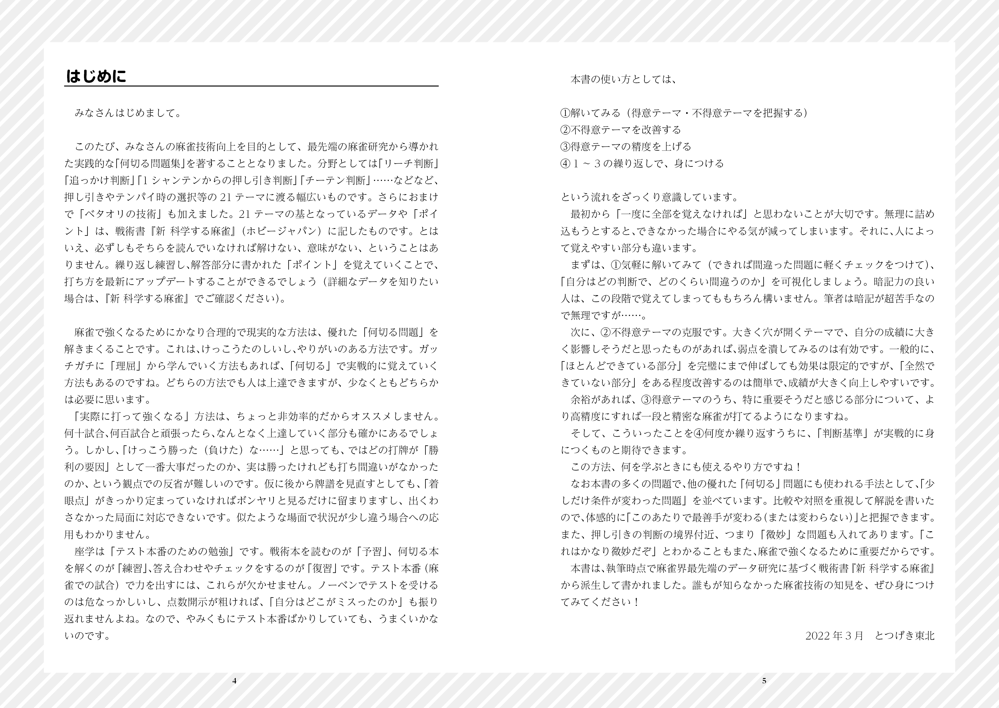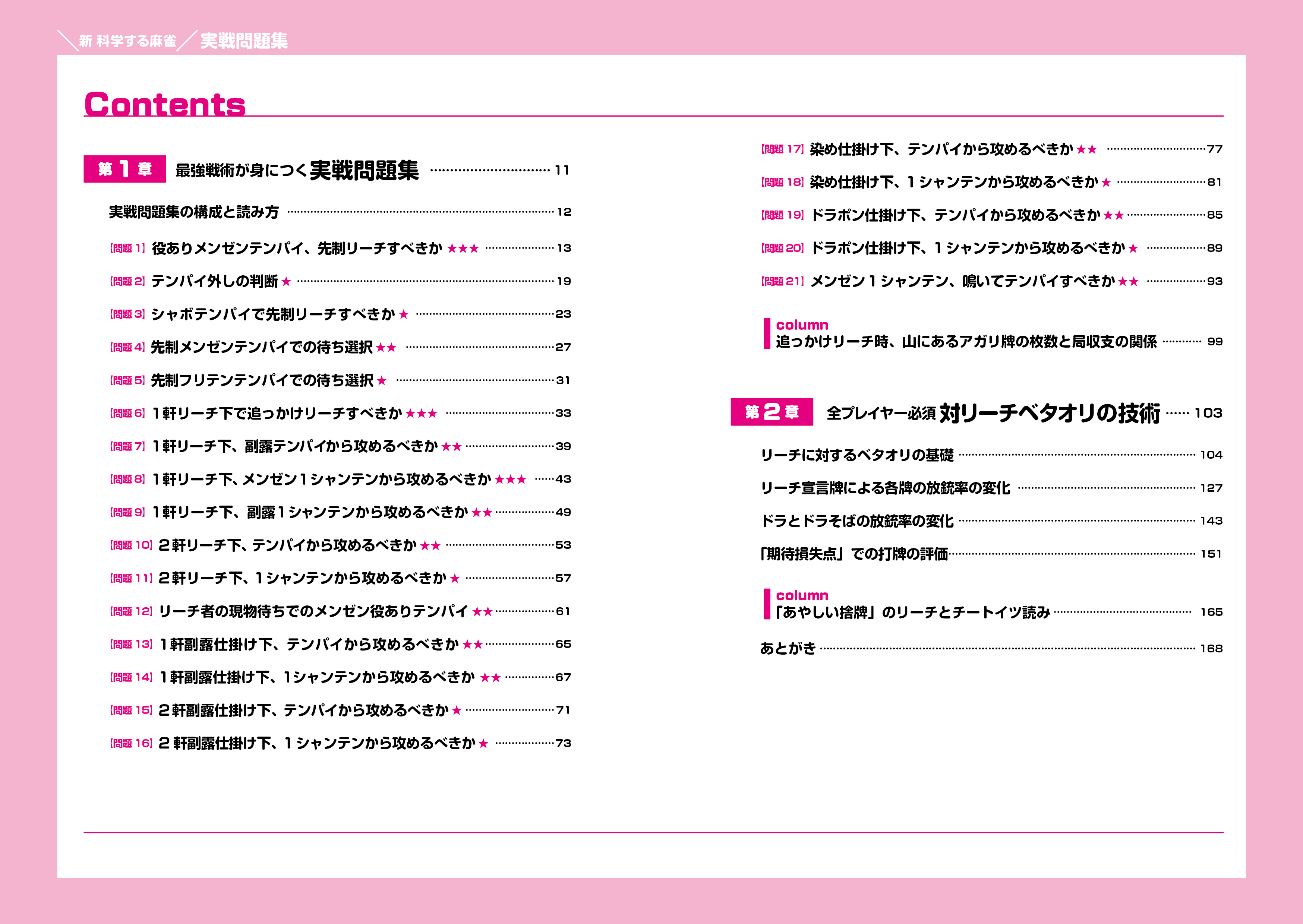 解答は、新規開発されたシミュレータで麻雀における状況判断の最新の基準を示した『新 科学する麻雀』に基づいていますが、必ずしも同書の知識を必要としません。