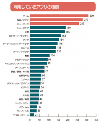 スマートフォンで利用しているアプリの種類を聞いたところ(複数回答可)、第1位は「ゲーム」、第2位は「写真/ビデオ」、第3位は「ミュージック」となりました。ゲームは手軽に隙間時間でプレイできるので、男女問わず人気が高いアプリだと言えます。