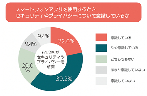 また、「あまり意識していない」、「意識していない」という回答も18.8%おり、セキュリティやプライバシーへの意識が低い若年層も存在します。このことから、生活の一部としてスマホアプリが使用されている現代において、若年層に対するアプリ利用時のセキュリティやプライバシーに関する意識啓発の重要性が、今後より一層高まると考えられます。さらにアプリ提供者がセキュリティやプライバシーに配慮したアプリ開発を実施するなど、安全にアプリを利用できる環境整備が必要です。