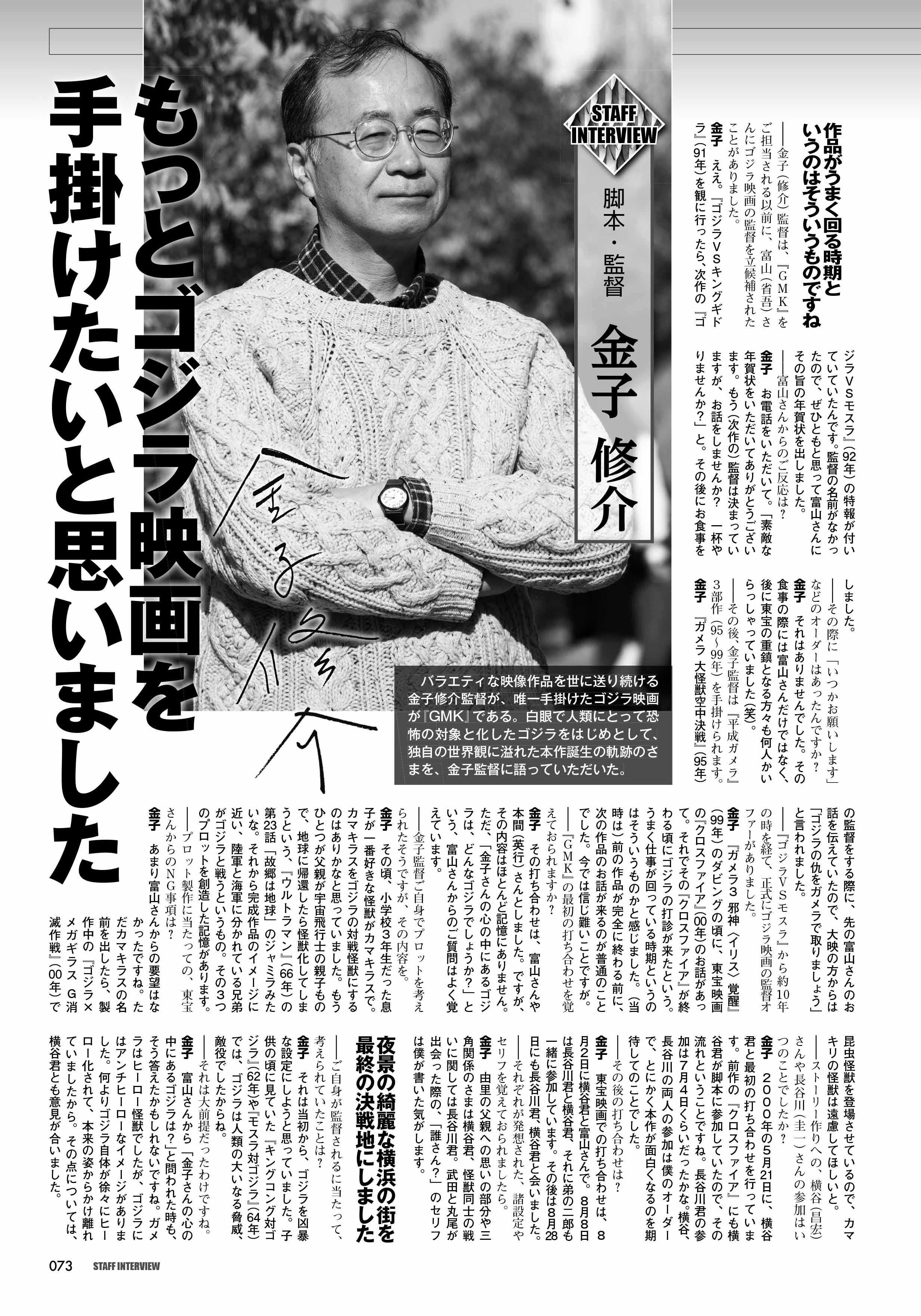 本書は、『ゴジラ・モスラ・キングギドラ 大怪獣総攻撃』の当時公開できなかったものや発掘された資料、初掲載となる写真素材などを中心に構成しております。加えて未発表の検討稿や準備稿などのシナリオ、撮影当時の現場スタッフ・関係者が撮った写真、証言なども掲載! 主演の宇崎竜童氏をはじめとするキャストに、金子修介監督、神谷誠特殊技術らの制作スタッフインタビューも収録した、GMK書籍の決定版です!