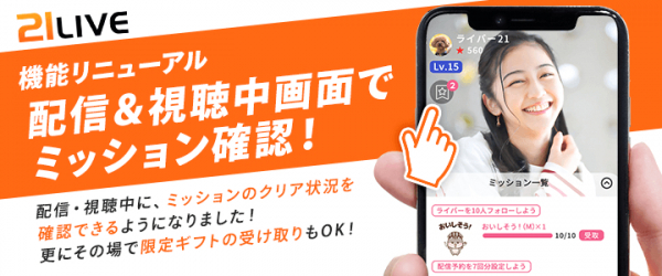 株式会社エムアンドティーティー(本社:沖縄県北谷町、代表取締役:井藤 三知子)が運営するエンターテイメント・ライブ配信サイト【21LIVE(ニーイチライブ)】URL: https://21.live では、2022年3月31日(木)より配信画面および視聴画面からミッションのクリア状況を確認できるようになりました。