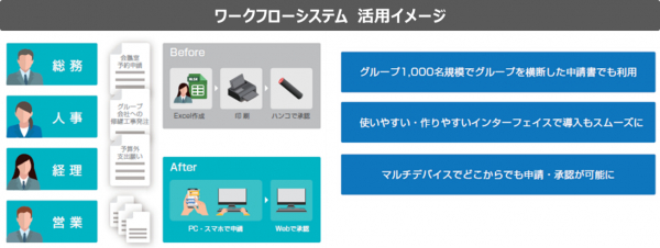 まずは、「総務」、「人事」、「経理」の押捺書類、グループ間で取り交わす40文書からワークフロー化をスタートしたところ、Excelで設計した書類を取り込める操作性と、マルチデバイスで使える利便性が社員に好評で、「便利になった」、「劇的に業務が効率化した」といった声も挙がり、中長期的な目標である、グループ全体の印鑑&ペーパーレス化の早期実現に向けて、大きな効果を得ています。