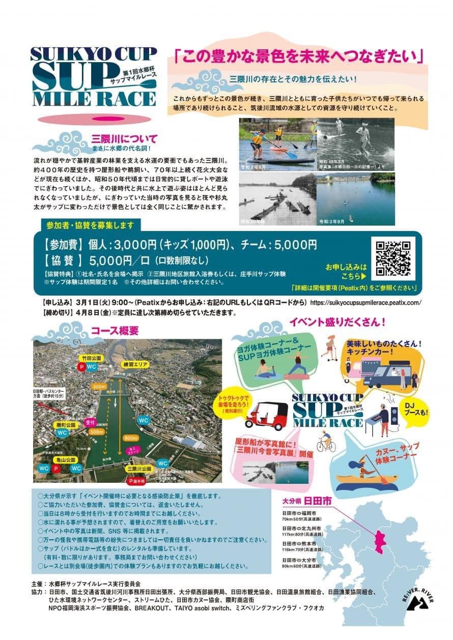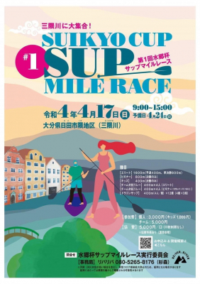 水郷杯サップマイルレース実行委員会は、第1回SUIKYO CUP SUP MILE RACEを日田市隈地区(三隈川)で行います。