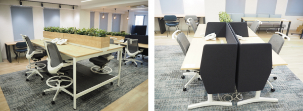 施設管理部は主業務が設備管理や修繕工事対応のため外出が多く、オフィスで従業員同士がコミュニケーションを取ることやディスカッションすることが生産性の向上になると考えました。そのため、一般的な対抗島型のレイアウトでフリーアドレスを採用しました。