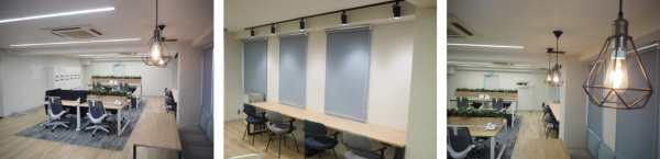 執務エリアはデスク環境に合わせて数種類の照明器具を採用しました。業務を行うことを想定したデスク頭上には、効率的に空間を照らすことのできる角型の照明を設置。一方、集中することやリラックスすることを目的としたカウンター席やソファ席の照明は、スポットライトや天井から吊るすペンダントライトを使用しています。