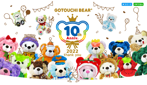ご当地ベアは、ご当地性のあるデザインを特徴に各地域の限定商品として2012年より販売し、現在は300種類を超えるご当地ベアが誕生しています。10周年特設サイトやロゴの他、これまでの感謝の気持ちを込めて、多くの方に楽しんでいただけるような10周年企画も予定しております。(詳細は決まり次第、お知らせいたします)
