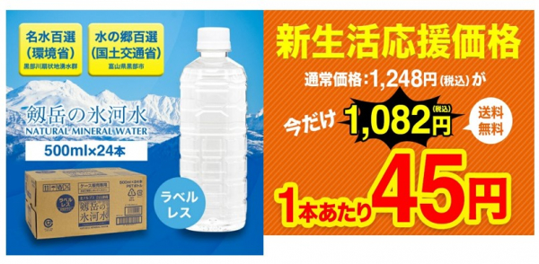 株式会社OTOGINO(オトギノ:代表取締役社長 鬼武公洋 本社 大分県日田市北友田 2 丁目 2123 番地 1)は、株式会社ファームが製造するナチュラルミネラルウォーター「剱岳の氷河水」の新生活応援キャンペーンを3月29日より4月11日まで開始します。